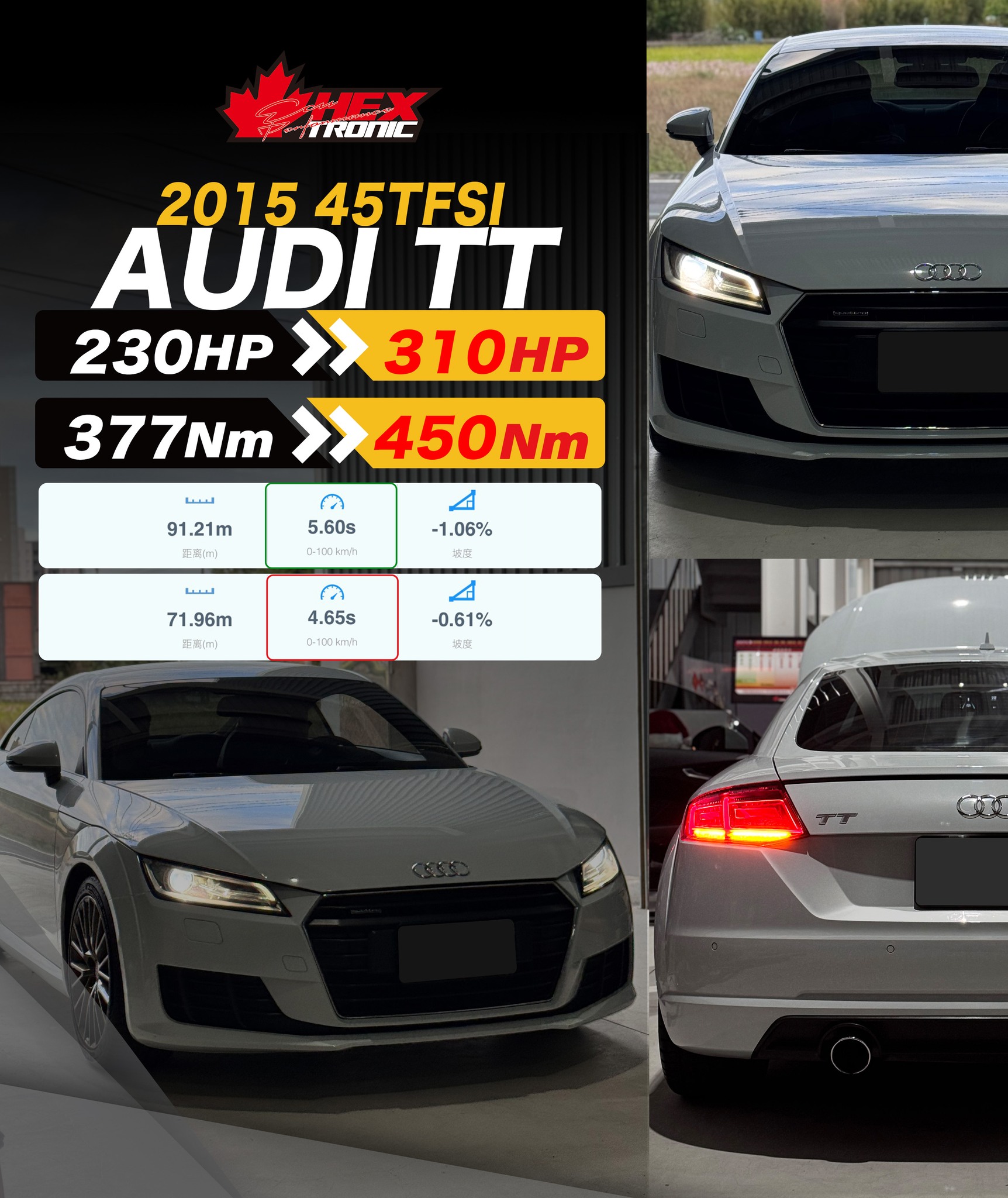 05 12 月 AUDI, EA888 Gen3, 馬力提升 2015 Audi TT 45 TFSI|ECU 內寫一階+TCU 變速箱升級2025-12-05 By 管理員 但這次做完 內寫 + 變速箱升級 後,不裝了,就是想跑快一點。升級成果 馬力: 230HP ➜ 310HP 扭力:377Nm ➜ 450Nm0–100 km...閱讀更多