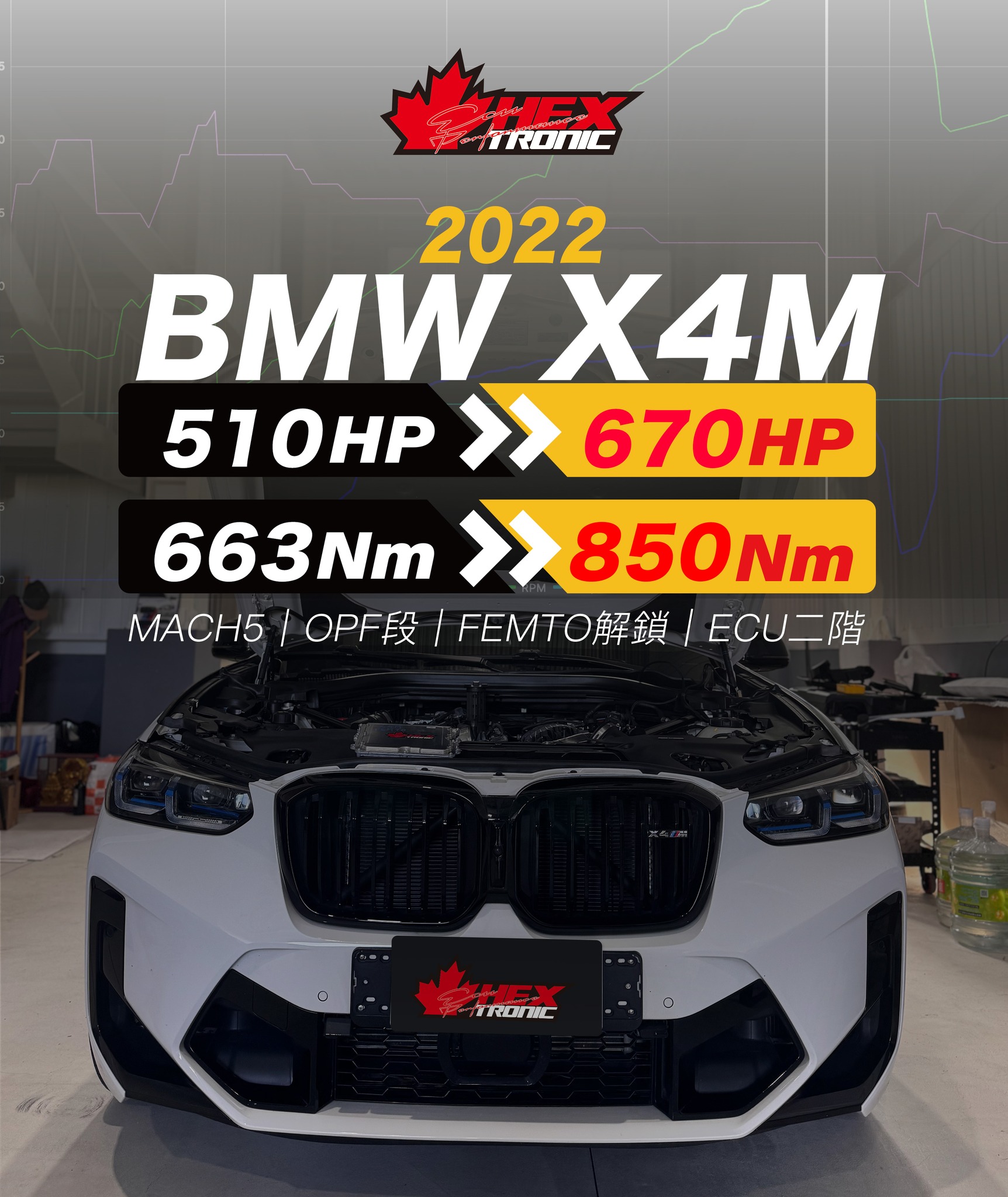 05 12 月 BMW, 馬力提升 2022 BMW X4M|FEMTO 解鎖+ECU內寫二階2025-12-05 By 管理員 同時升級 MACH5 OPF 排氣段升級成果 馬力:510HP ➜ 670HP 扭力:663Nm ➜ 850Nm0–100 km/h(#Dragy)...閱讀更多